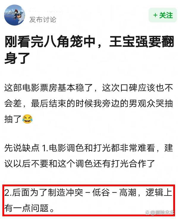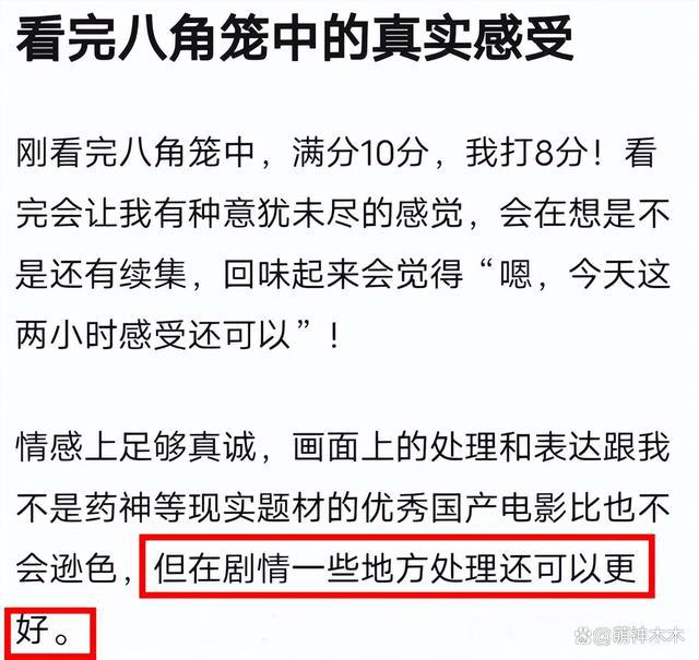 ——有原型的电影注定在剧情上受限,毕竟要考虑影响,不能随意改编,所以导致《八角笼中》剧情节奏有些问题,不止一位观众提到,整部电影剧情略显刻意,有种套路化的感觉,逻辑转折带了点生硬感。