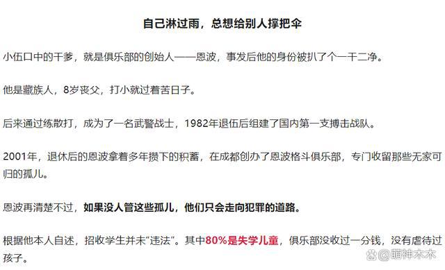 王宝强饰演的男主向腾辉原型就是恩波格斗俱乐部的创始人,他收养了大批无人照顾的男童,训练他们格斗技巧,把孩子们培养成才,在自己的能力范围内给他们一个出路。