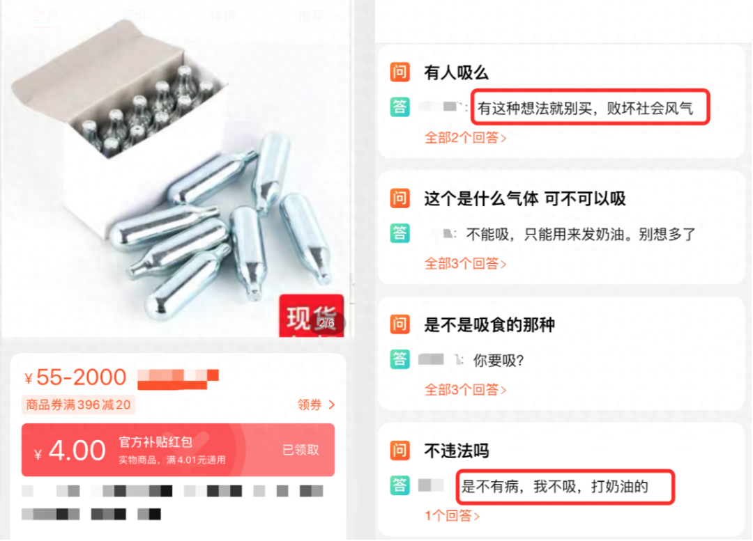 商家将“笑气”改头换面,以“奶油气弹”、“奶油气囊”、“奶油耗材”等名目进行销售。有些网购平台,也只是简单屏蔽了“奶油气弹”这个关键词的检索,并未将相关产品下架。