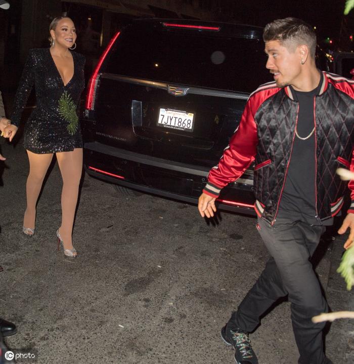当天晚上,玛丽亚·凯莉非常高兴,酒也喝得有点多。她与男友一前一后,深情对望,恩爱十足。(图片来自 IC photo)