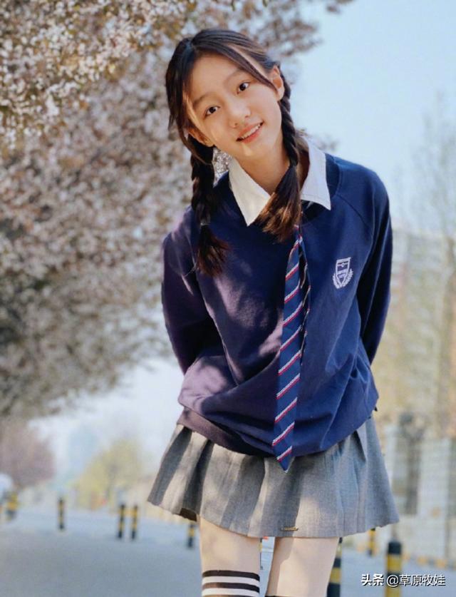 纪姿含的长相很讨人喜欢,扎上了双马尾的她看着特别的有少女感,而且看着特别的简单干净。她身穿了一套校园风的套装,蓝色的卫衣搭配衬衫,看着很简单干净的样子,而配上了灰色的百褶裙后,看着很是清纯的感觉。