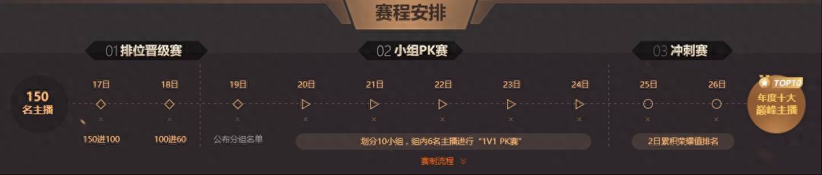 冲刺赛,2天荣耀值累计排名前十,加冕年度十大巅峰主播。