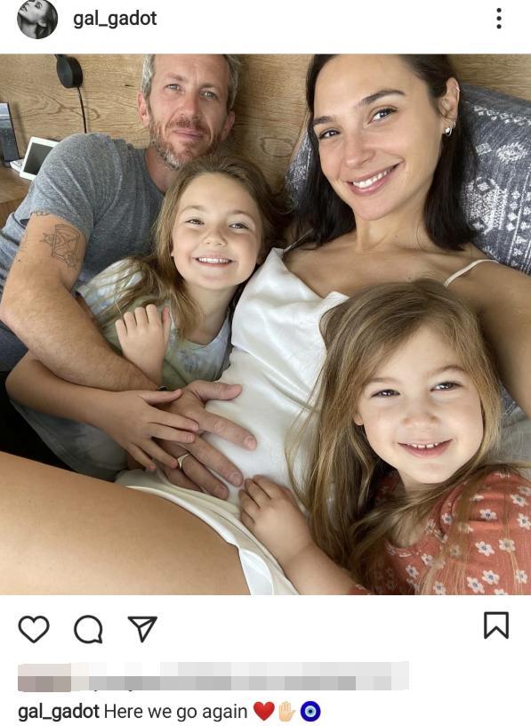 36岁知名女星盖尔加朵(Gal Gadot)此前在社交平台宣布怀上三胎喜讯,并晒出全家福,配文称:“Here we go again”,据悉盖尔加朵与富豪老公Jaron Varsano结婚12年,已经育有两个女儿。