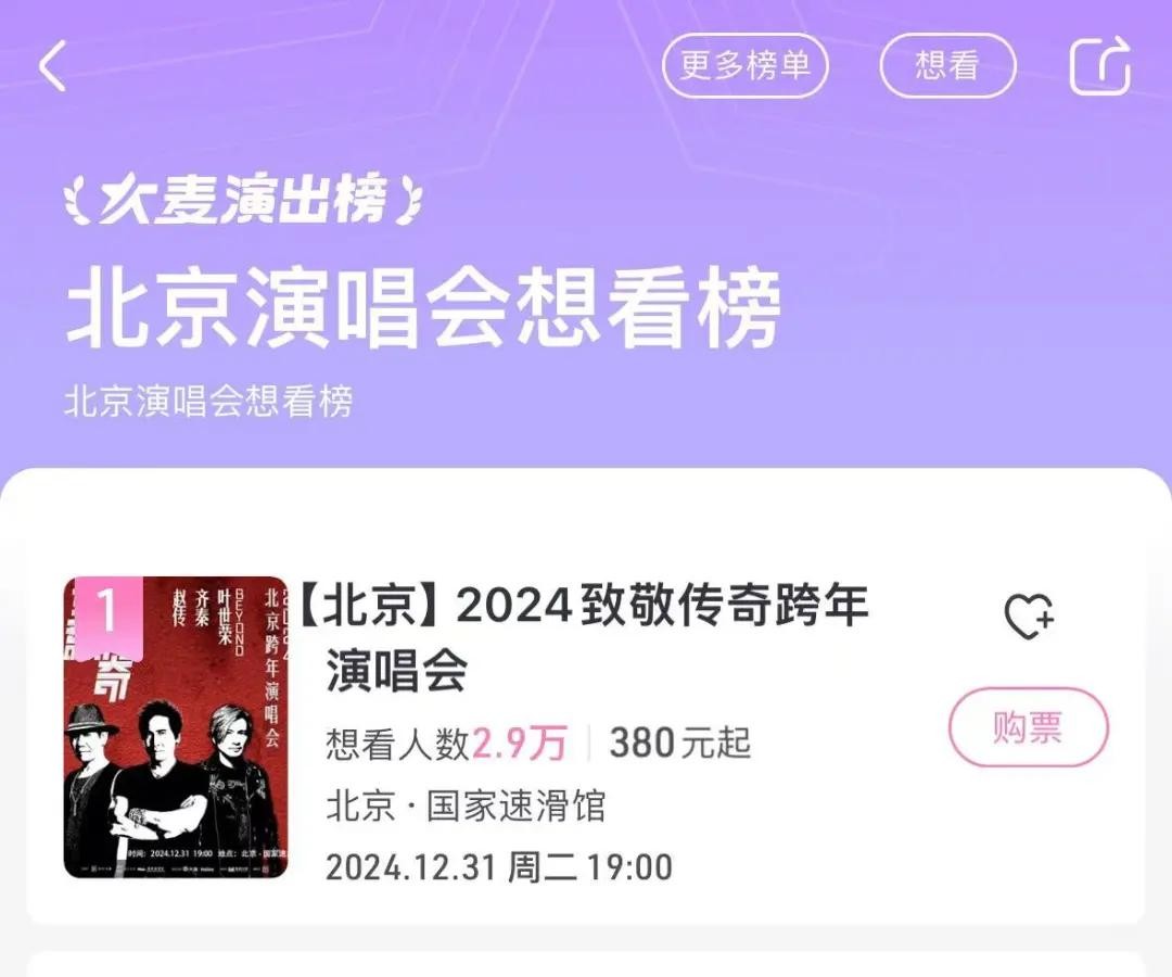 大麦平台显示,演出票正常开票中。同时,该演唱会在大麦北京演唱会想看榜上排名第一。