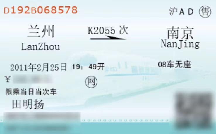“我们在死者内裤暗袋里发现了一张火车票。”虽然车票被血迹浸泡、揉得破烂不堪,但在现代科技帮助下,清晰显示出:2011年2月25日,兰州到南京,乘坐人田明扬。