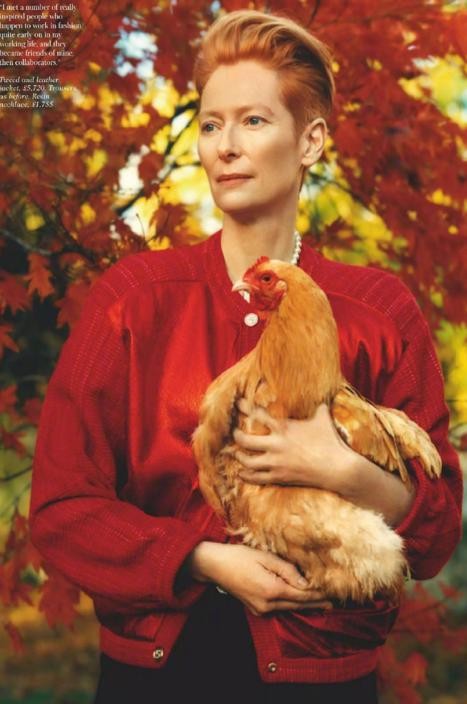 1月8日,"古一"法师扮演者蒂尔达·斯文顿为《Vogue》拍摄的时尚写真正式曝光,让人意外的是,此次造型她怀中抱着一只鸡,搭配田园风格的摄影,人与鸡的画面非常温馨和谐。