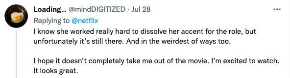 我知道她很努力在饰演这个角色时去掉自己的口音了,但不幸的是还是有一些,而且很奇怪。我希望这点别让我出戏,我很期待这个片子,它看起来很棒。