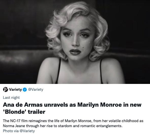 最近,由网飞推出的传记片《金发梦露》(Blonde)发布了完整版正式预告片。