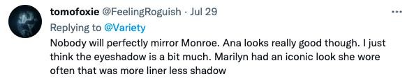 没有人能够完全地成为梦露,但 Ana 看起来已经够好了。我只是觉得眼影有点儿重了,梦露的妆容很经典,她经常画着明显的眼线和较轻薄的眼影。