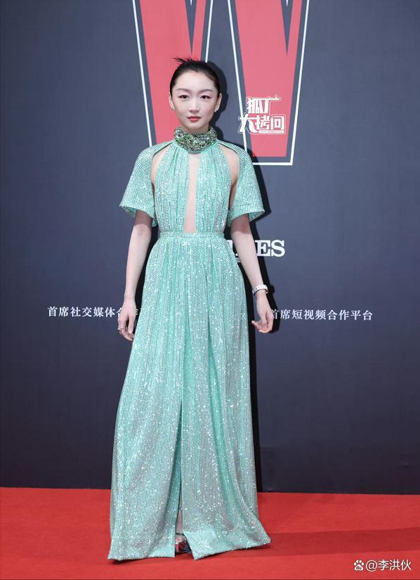 周冬雨身着一身青绿色的设计感长裙,胸前拼接布条仅仅遮住重点部位,脖颈处缀满亮片的厚重领口与轻盈单薄的裙子风格相悖。