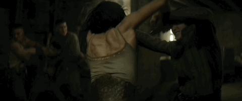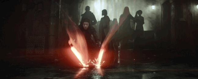 裴斗娜饰演的女武士,手持一对发红光的长剑。