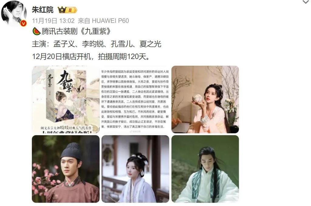 还将作为一番女主出演古装剧《九重紫》,搭档凭《星汉灿烂》《封神》走红的新晋古装帅哥李昀锐(预计十二月中旬进组)。