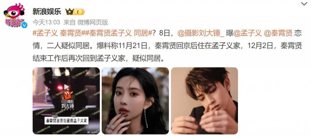 狗仔爆料,秦霄贤分别于 11 月 21 日和 12 月 2 日住在孟子义北京的家,两人疑似同居。