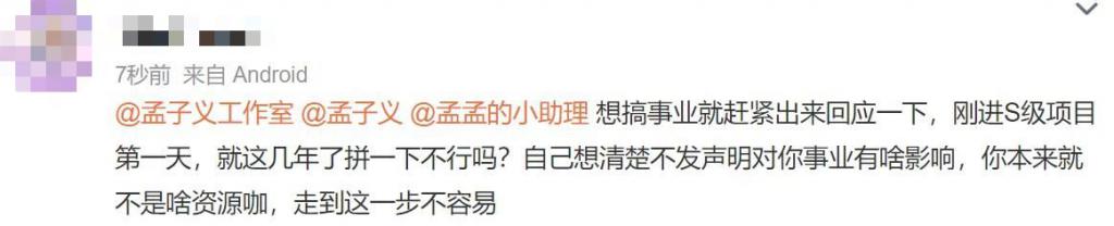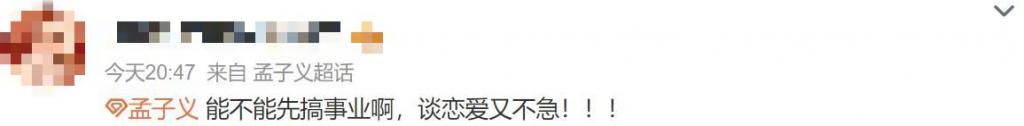 除了看热闹的人群,热评里还有孟子义的事业粉,她们不关心这些后知后觉的恋爱糖,而只想提醒偶像:姐,你还在事业上升期,还能不能争气点?