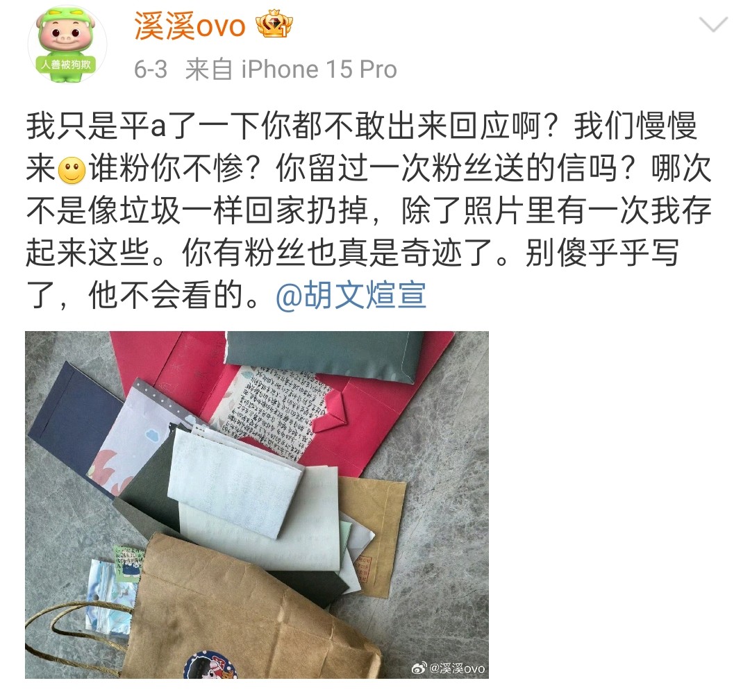 见胡文煊没有任何回应,溪溪晒出了一堆粉丝写给胡文煊的信,称他不爱粉丝,把粉丝的信当垃圾丢掉。