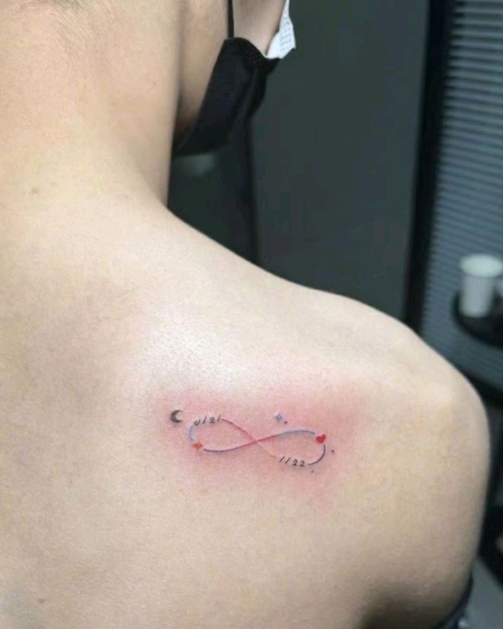 是一个数字符号无限的图标,胡文煊的纹身上写着0121和1122,是胡文煊妈妈和溪溪的生日。