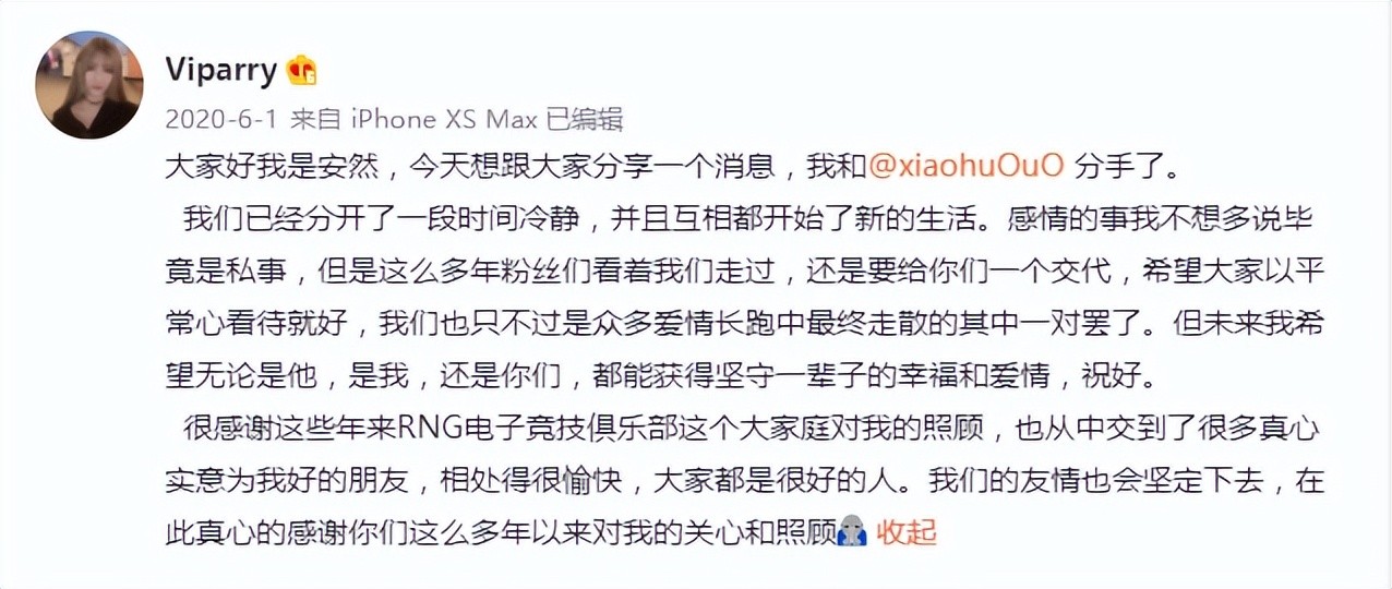 两人去年分手时就有人质疑是不是小虎出轨了女粉丝,但是安然当时的回复很大气,就是简单地陈述了分手这件事。