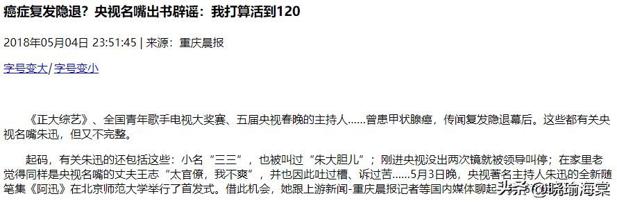 重庆晨报2018年05月04日癌症复发隐退?央视名嘴出书辟谣:我打算活到120