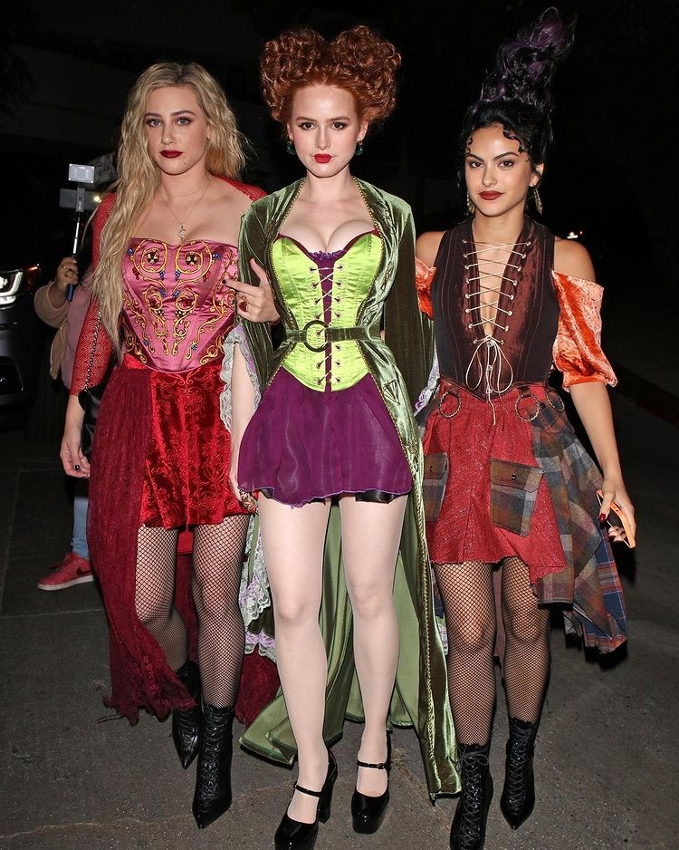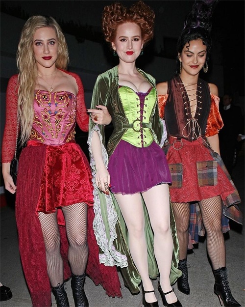 《河谷镇》的三位女主角丽丽·莱因哈特(Lili Reinhart)、卡米拉·门德斯(Camila Mendes)、玛德莱娜·佩切(Madelaine Petsch)一起扮装成《女巫也疯狂》中的「山德森姐妹」,不过服装稍微改版、添加了些许性感的小心机,每年都精心打扮的她们今年不外乎也成为好莱坞万圣节派对的焦点!