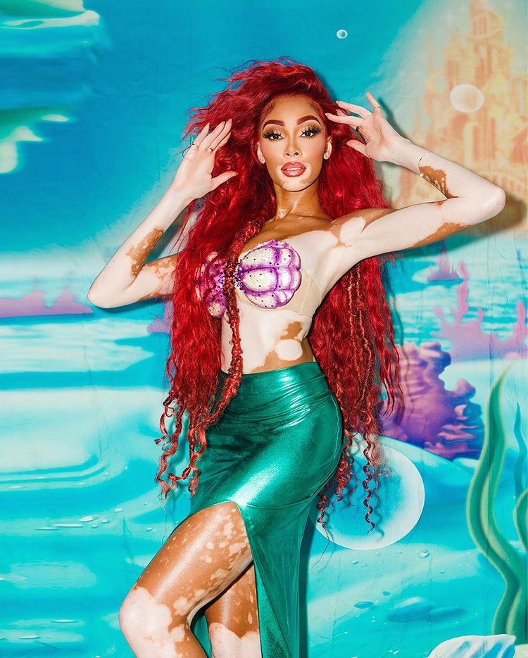 超模温妮·哈洛(Winnie Harlow)在万圣节装扮成迪斯尼经典卡通《小美人鱼》中的「艾莉儿」,一同艳丽的红发配上紫色贝壳胸围,简直美出新高度!由她来演真人版《小美人鱼》应该也很适合~