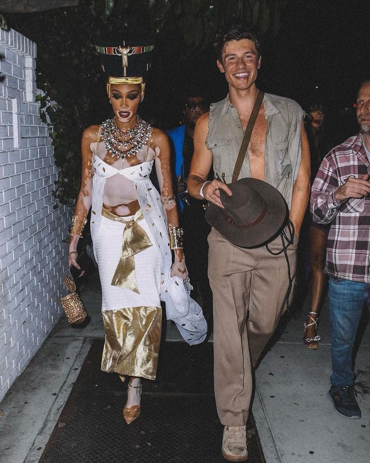 除了变装成小美人鱼之外,随着夜幕降临,温妮·哈洛(Winnie Harlow)也化身性感的埃及艳后!一旁的歌手肖恩·门德斯(Shawn Mendes)今年则是简单变装,没有大玩花样,从服装来看应该是探险家或考古学家…?不过有结实的胸膛+粗壮的手臂就直接先给100分啦!