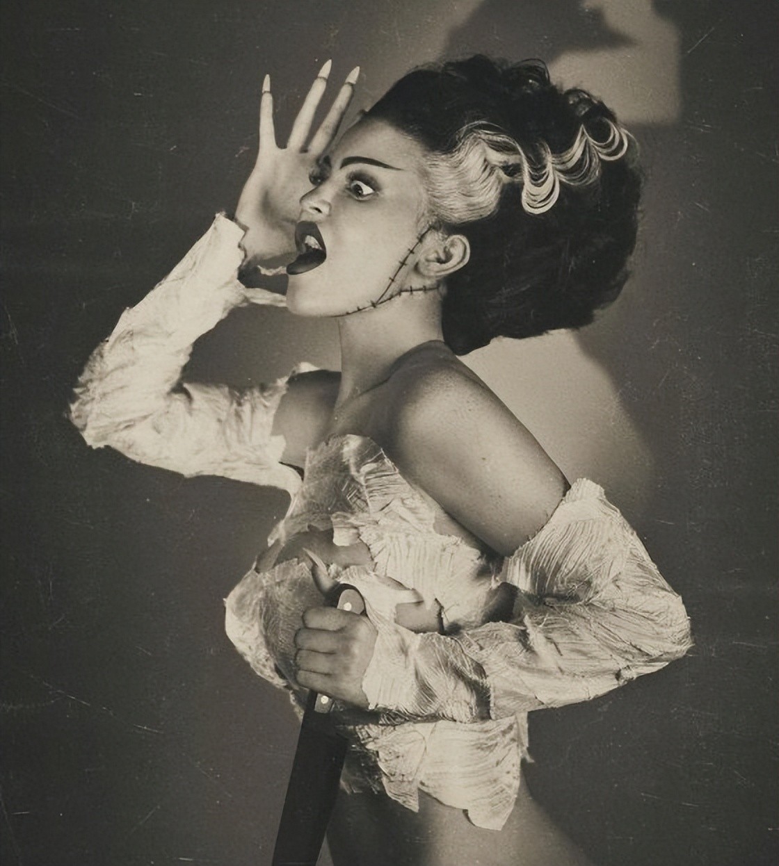 凯莉·詹娜除了扮演女巫之外,在万圣节还变装成科学怪人的新娘!拿着一把刀加上超浮夸的表情,仿佛濒临疯狂边缘,太有万圣节气息了~好身材一览无遗,太养眼啦!