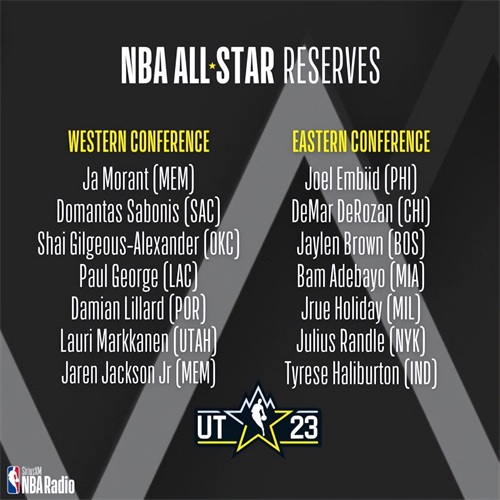 西部替补:亚历山大(雷霆)、莫兰特(灰熊)、小萨博尼斯(国王)、保罗·乔治(快船)、小贾伦·杰克逊(灰熊)、利拉德(开拓者)、马尔卡宁(爵士)