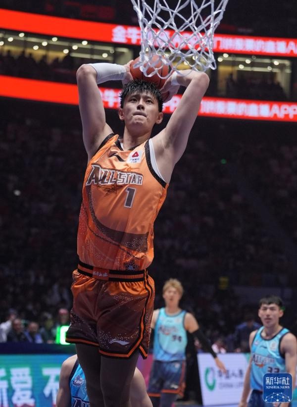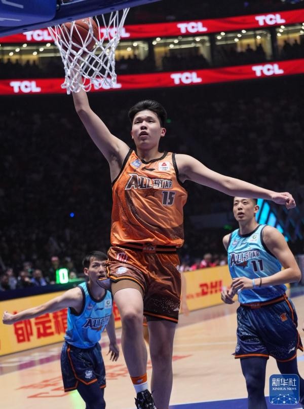↑北区明星队球员张镇麟在比赛中扣篮。新华社记者 孟永民 摄