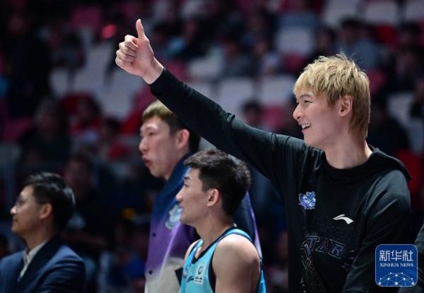 ↑南区明星队球员王哲林(右)在场边为队友加油。新华社记者 魏培全 摄