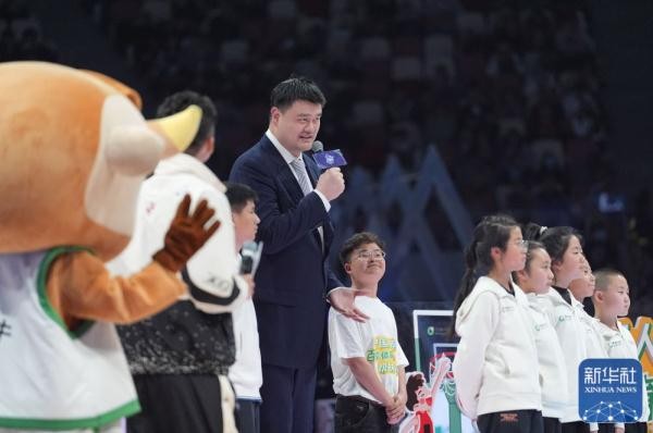 ↑中国篮协主席姚明在中场活动中致辞。新华社记者 孟永民 摄