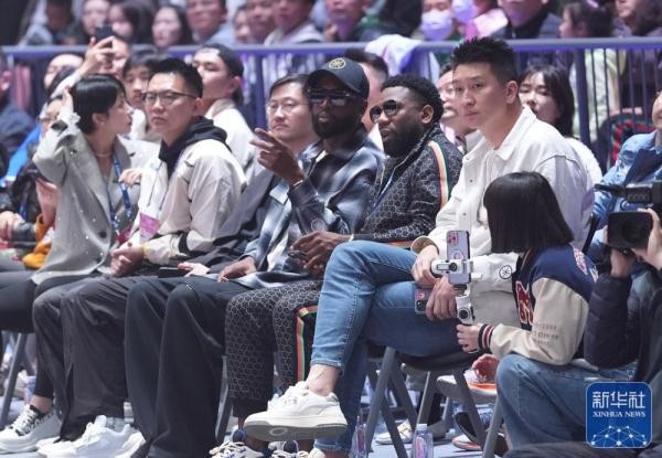 ↑前NBA球员韦德(中)在场边观看比赛。新华社记者 孟永民 摄