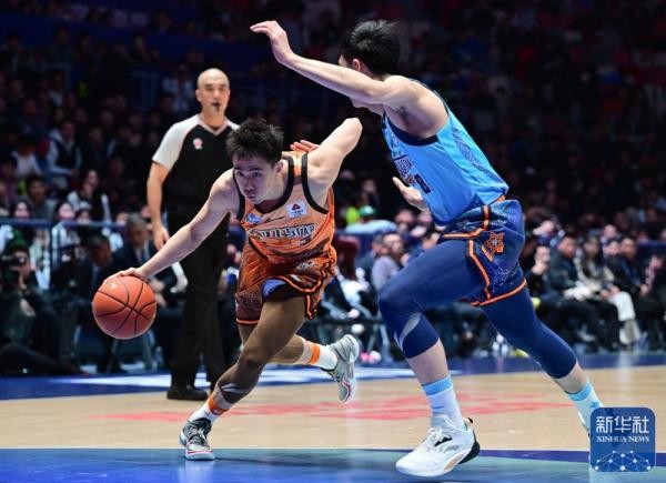 ↑北区明星队球员赵继伟(左)突破南区明星队球员崔永熙的防守。新华社记者 魏培全 摄