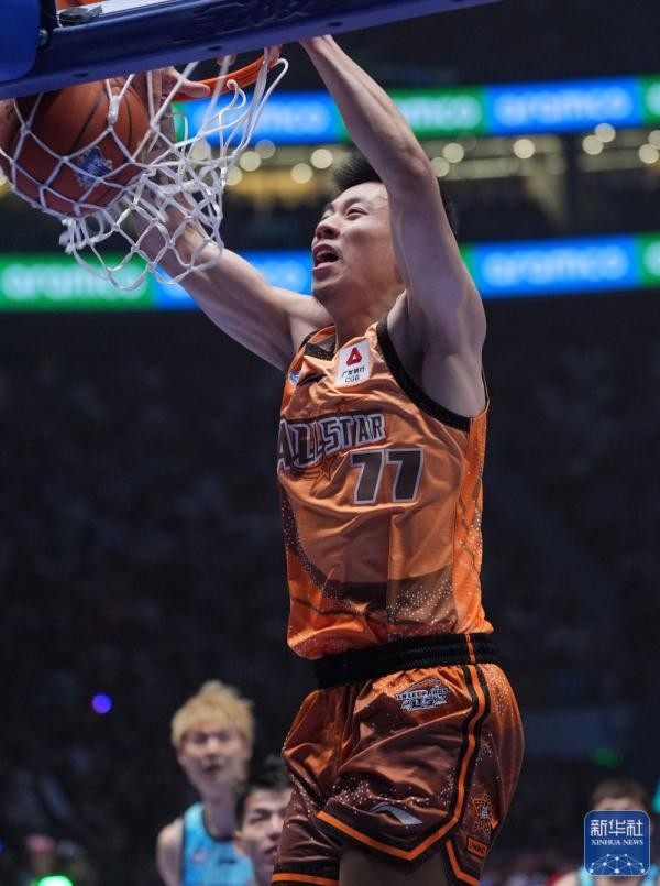 ↑北区明星队球员曾凡博在比赛中扣篮。新华社记者 孟永民 摄