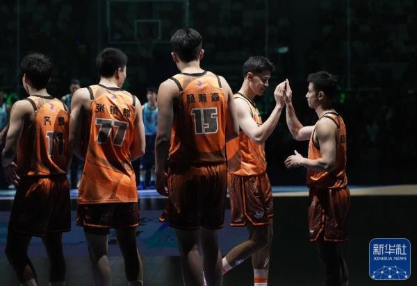 ↑北区明星队球员赵继伟(右一)与队友阿不都沙拉木在出场时击掌。新华社记者 孟永民 摄