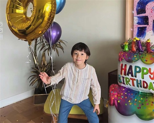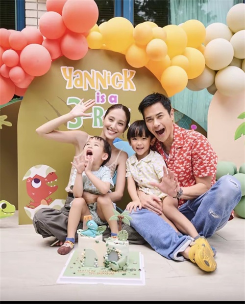 那天小儿子8岁生日宴,她搂着俩混血儿子拍全家福,法国老公Julien站得比酒店门童还端正。