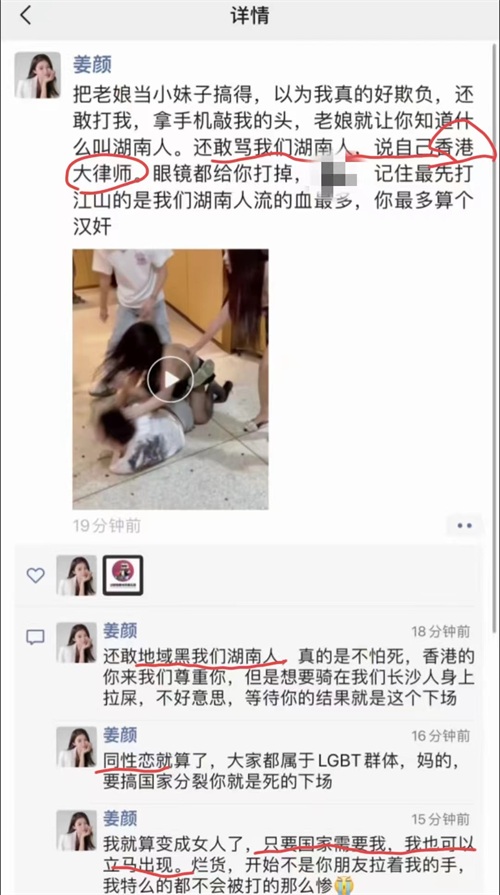 据悉,事件的起因是这位女士在和朋友们用餐时,遭遇了一位自称是香港大律师的男子的无端辱骂。他不仅口出狂言,还对湖南地区进行了贬低,称湖南人穷等不堪入耳的话。
