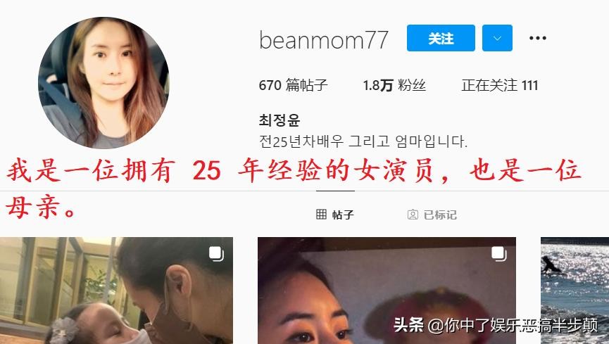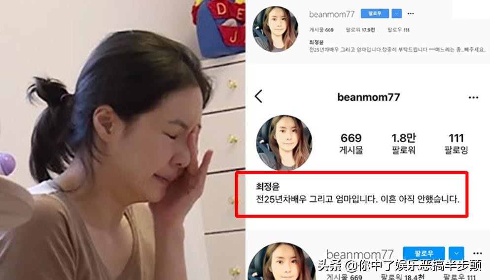 不过小编对于这个猜测方向,并不是很认可。因为在崔贞允被传出离婚消息之后,她有这样一个试图挽回婚姻的举动,所以这次离婚可能不是崔贞允主动提出,也就更不会预告离婚。10月6日,崔贞允曾在个人社交平台账号的资料里写下还没有离婚来回应离婚传闻,虽然很快删除只留下演员和母亲的身份,但是不难发觉她并不是很想离婚的状态。