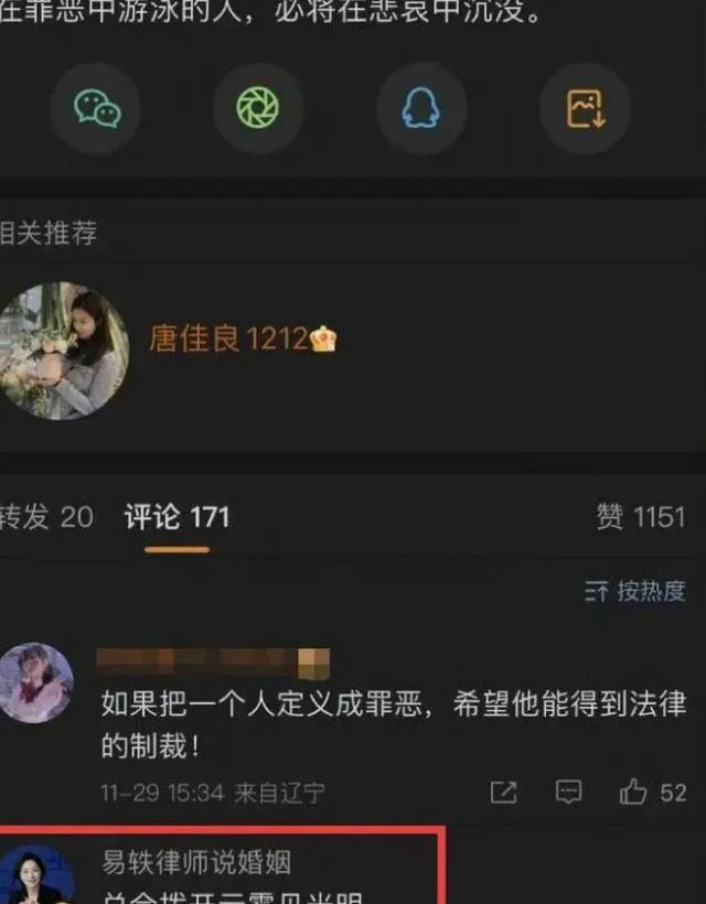 据网友爆料,唐佳良在11月30日凌晨1点多发了一条微博,内容是“在罪恶中游泳的人,必将在悲哀中沉没”,并配上了一张黑色的背景图。这条微博很快引起了网友的关注,有人猜测这是在暗指杨鸣出轨,有人表示支持唐佳良,也有人劝她不要轻易放弃婚姻。有婚姻律师还在唐佳良的微博下面留言安慰她,说“如果你需要帮助,可以联系我,我是专业的婚姻律师,可以为你提供法律咨询和代理服务”,疑似暗示唐佳良已经打算离婚。