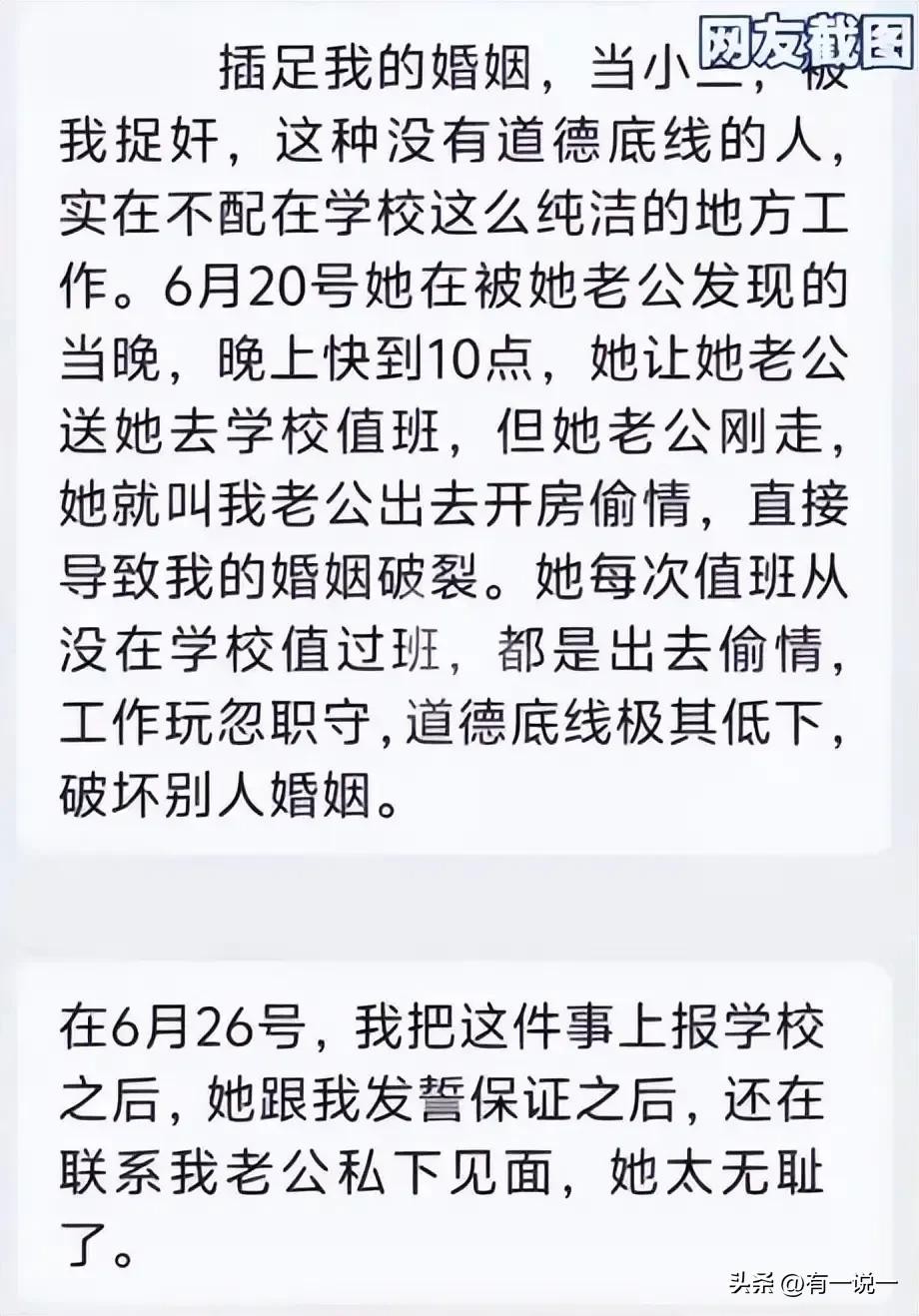 据悉,当时情人的老婆也在场,一怒之下将他们的事情曝光在学校的千人群中。从曝光的信息来看,这位男老师的老婆已经经给过女老师一次机会了,可是没有几天又勾搭在一起了,实在忍无可忍,将此事曝光。