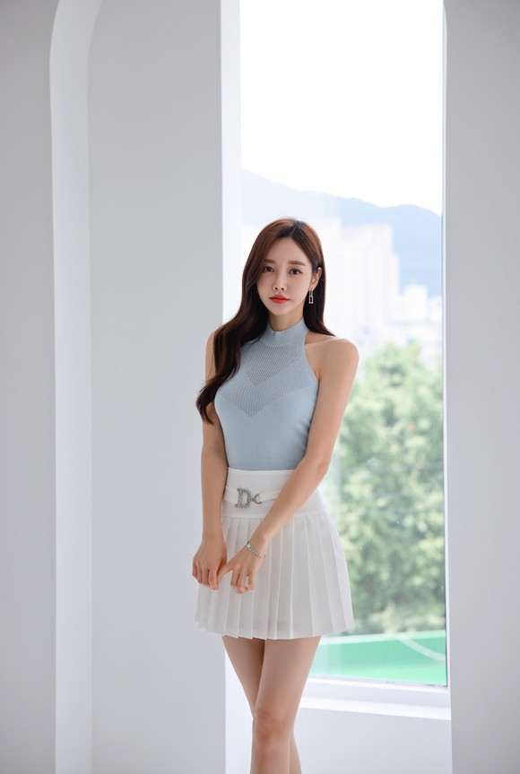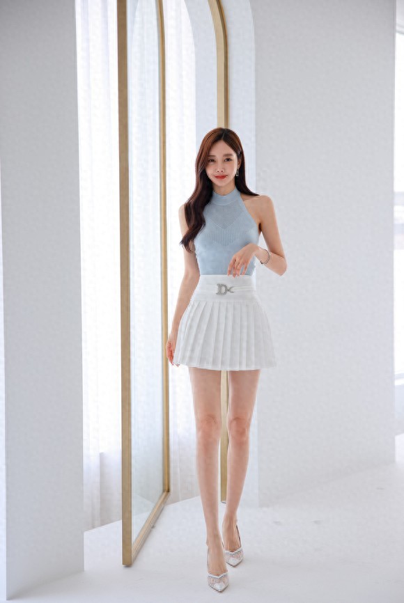 时尚美图:绝美养眼浅蓝无袖裙美女图集