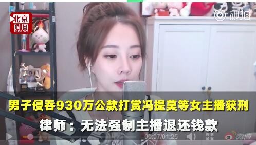 【男会计挪用公款930万打赏约会女主播冯提莫确实被打赏】#挪用公款打赏冯提莫#近日,央视报道月薪3000元的王某挪用930万公款打赏女主播,网友称其中一主播为@冯提莫。6月13日,@时间新闻从权威人士处获悉,被打赏的女主播中确有冯提莫。律师认为:无法强制主播退还钱款。