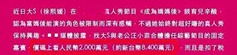 虽然对刘涛在综艺里的片酬了解不多,但考虑到大S每季2000万的片酬,刘涛的身家应该不会低很多。