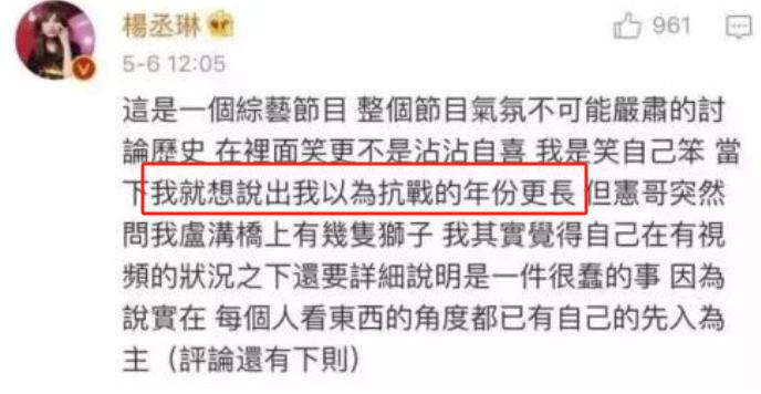 2017 年,杨丞琳首次发文回应,深刻反思了自己的失言,在综艺里大笑其实是在笑自己笨,更没有沾沾自喜的意思。