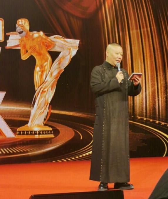 图中,郭德纲身穿大褂,站在舞台上主持节目!