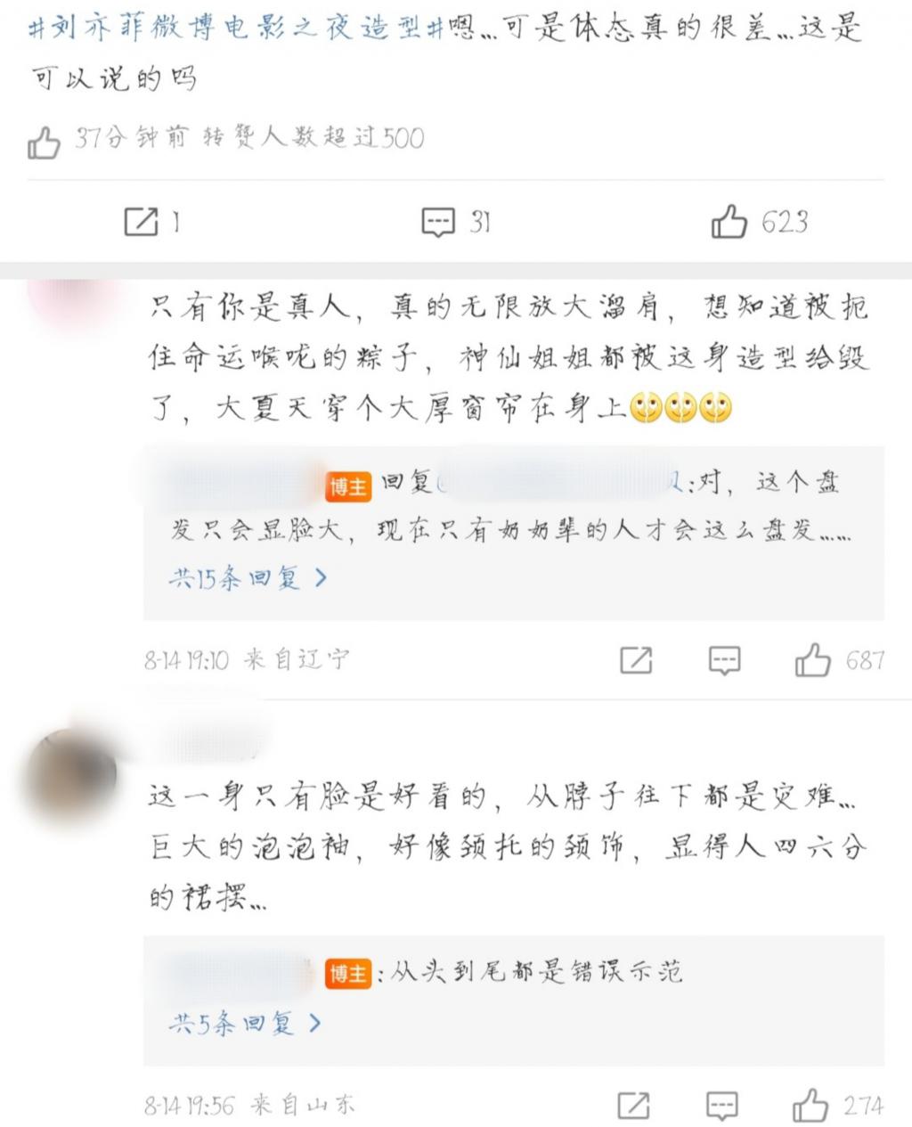 夸张的泡泡袖,将刘亦菲的头身比直接压缩。脖颈上的颈饰,在视觉上显得脖子粗,晃眼一看还以为戴着颈托保护脖子。而绷劲的腹部,给人呼吸不畅的感觉。