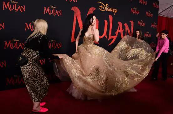 2020 年,由刘亦菲主演的迪士尼电影《花木兰》在洛杉矶举行首映。首映红毯上刘亦菲身穿一袭抹胸金色拖地长裙,同样是 Elie Saab 品牌的礼服。在拍照的时候,也是三个助理帮忙提裙和铺裙,相当有排面。可能是刘亦菲或是其造型室格外钟爱大裙摆露肩裙,所以多次红毯她都选用了这种礼服。
