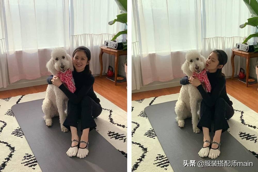 呆在家里,张娜拉一身黑色居家服也完全不老气,戴着同色发带露出灿烂笑容超甜蜜,脚下五指袜实力抢镜、搂着狗狗开心合影,39岁怎么丝毫不显老!