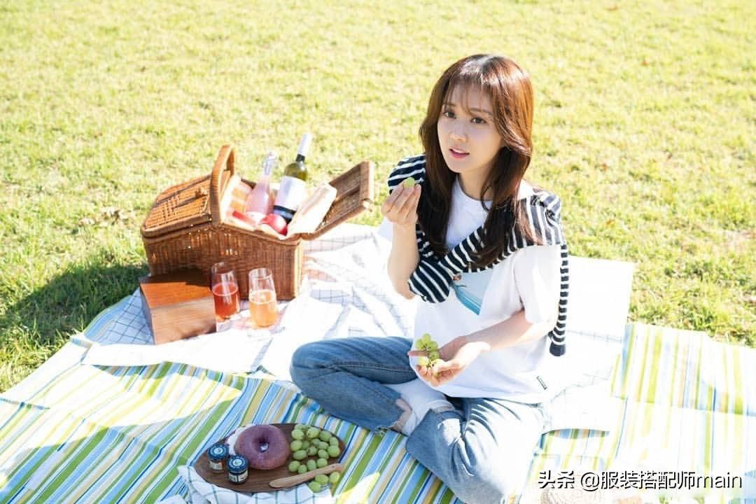 风和日丽外出野餐,白色印花t和牛仔裤的装束轻松休闲,只是简单在背上搭一条条纹卫衣,撞色质感和上身立刻产生呼应,层次显而易见,不仅提升辨识度,还为时尚感加分。微卷的焦糖色长发垂在胸前,可爱的模样敲有偶像剧女主角内味。