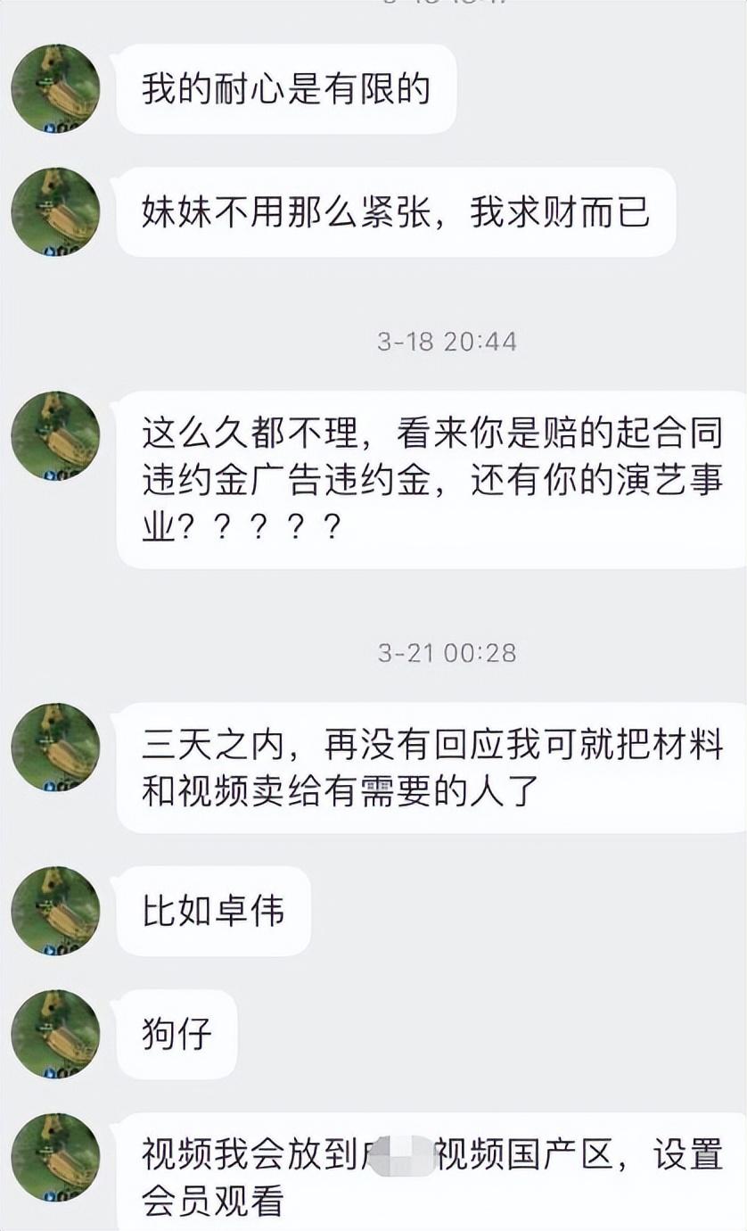 曝光的聊天截图里,该网友喊话给蒋梦婕三天的时间考虑,过期不花钱买视频的话,就会将这份视频发给蒋梦婕的合作品牌,并且传播到各大视频网站,彻底毁掉蒋梦婕。