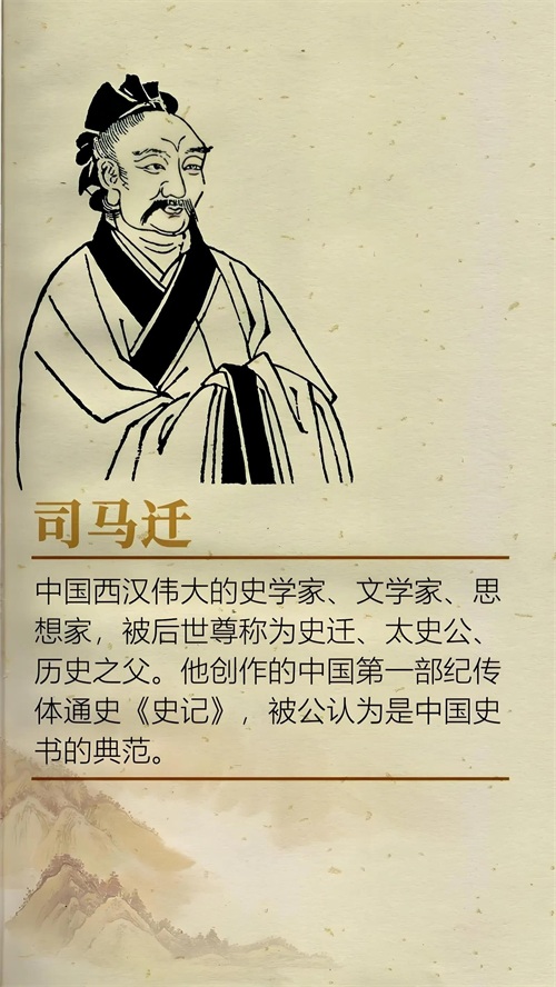 司马迁出生于汉朝的一个名门望族,其父亲司马谈是当时著名的历史学家,担任过太史令。受家庭环境的熏陶,司马迁自幼便对历史产生了浓厚的兴趣。年轻时,他游历各地,广泛收集历史资料,积累了丰富的知识。